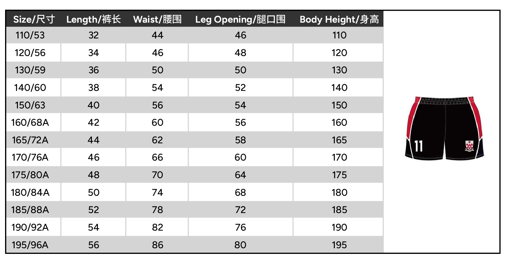 Size 110 or 120 or 130 or 140 or 150 or 160 or 165 or 170 or 175 or 180 or 185 or 190 or 195